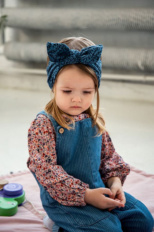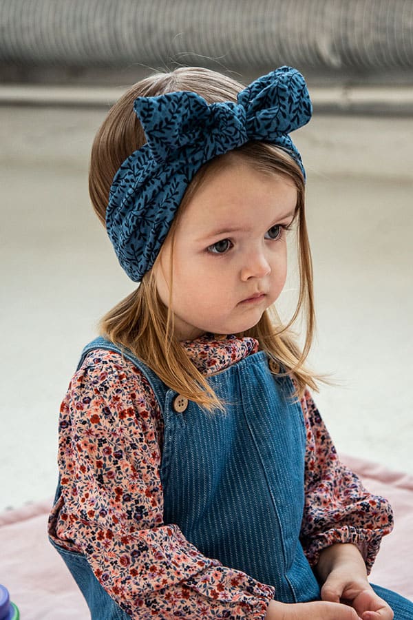 Muślinowa opaska dla dzieci o liściastym wzorze w kolorze granatowym. Każda opaska jest na gumce, dzięki temu dopasowuje się i nie uciska głowy.