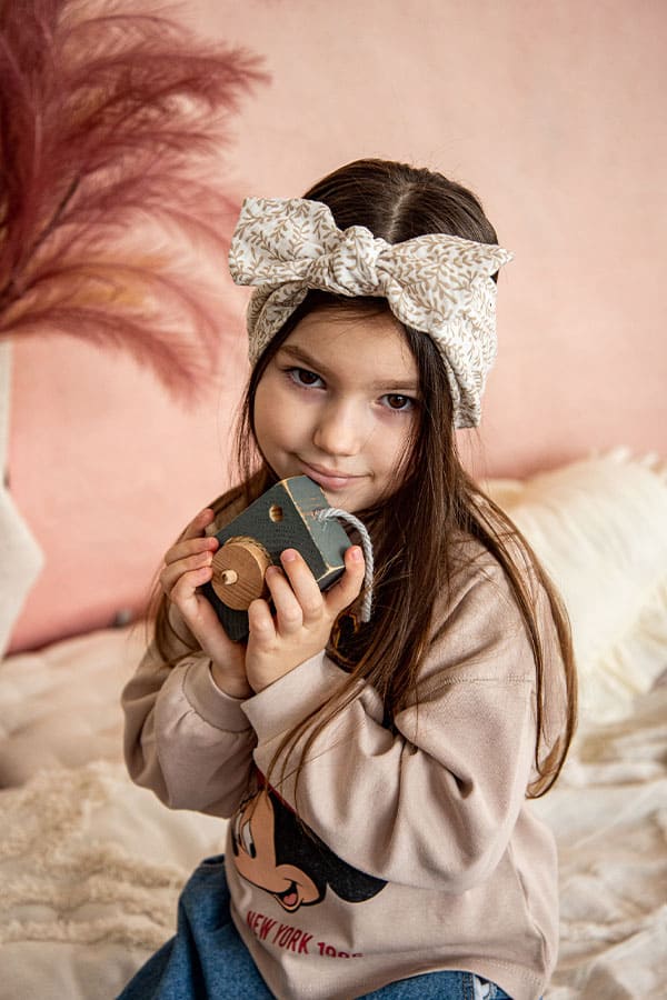 Muślinowa opaska dla dzieci o liściastym wzorze w kolorze kremowym. Każda opaska jest na gumce, dzięki temu dopasowuje się i nie uciska głowy.