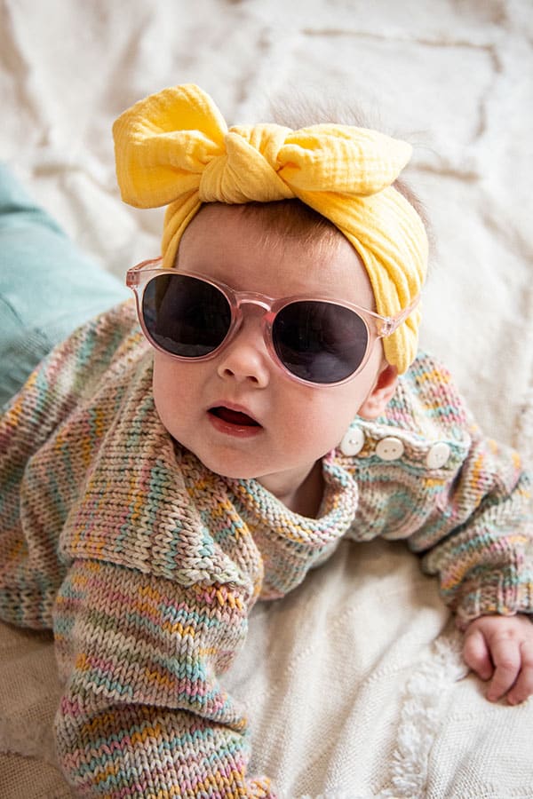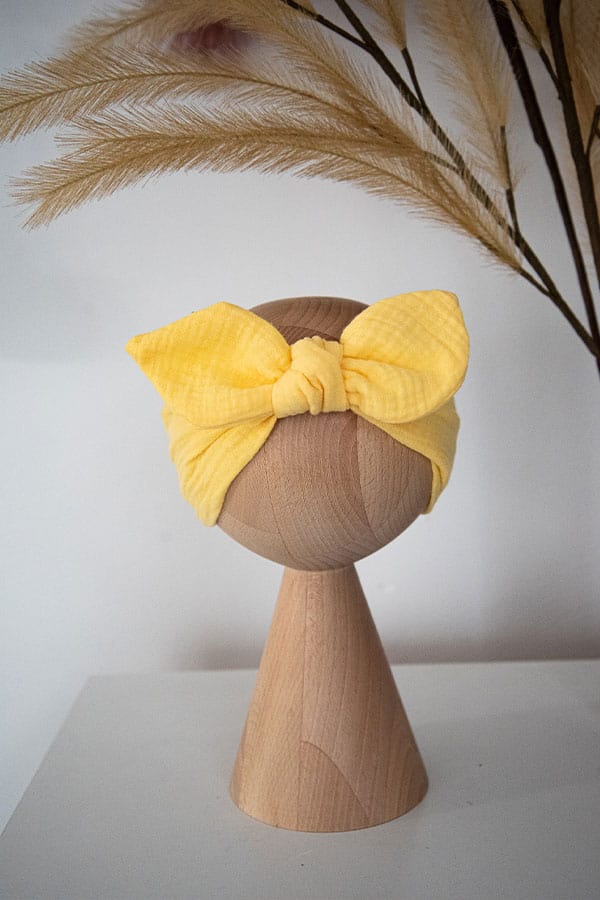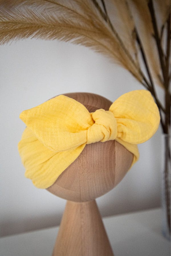 Muślinowa opaska dla dzieci w kolorze żółtym. Każda opaska jest na gumce, dzięki temu dopasowuje się i nie uciska głowy.