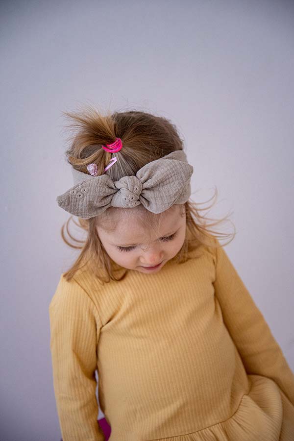 Przewiewna opaska wykonana z cienkiej bawełny z charakterystycznymi wcięciami. Opaski Tenia przygotowaliśmy w dwóch wersjach, Lazo i Nodo, sprawdzą się fantastycznie wiosną i latem. Wszystko dzięki materiałowi opasek, to 100% muślin bawełniany zapewnia, że skóra oddycha i nie ma obawy przegrzania lub nadmiernego pocenia.