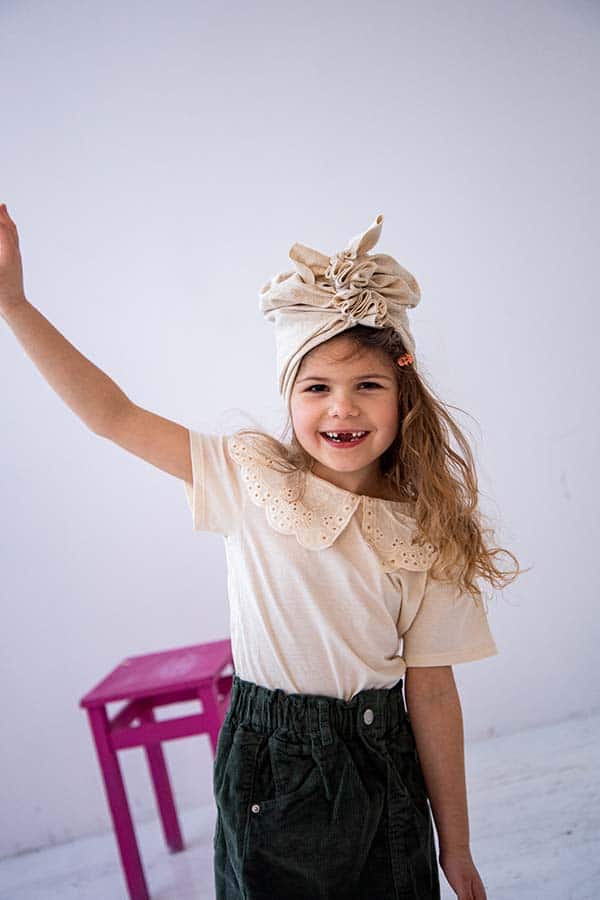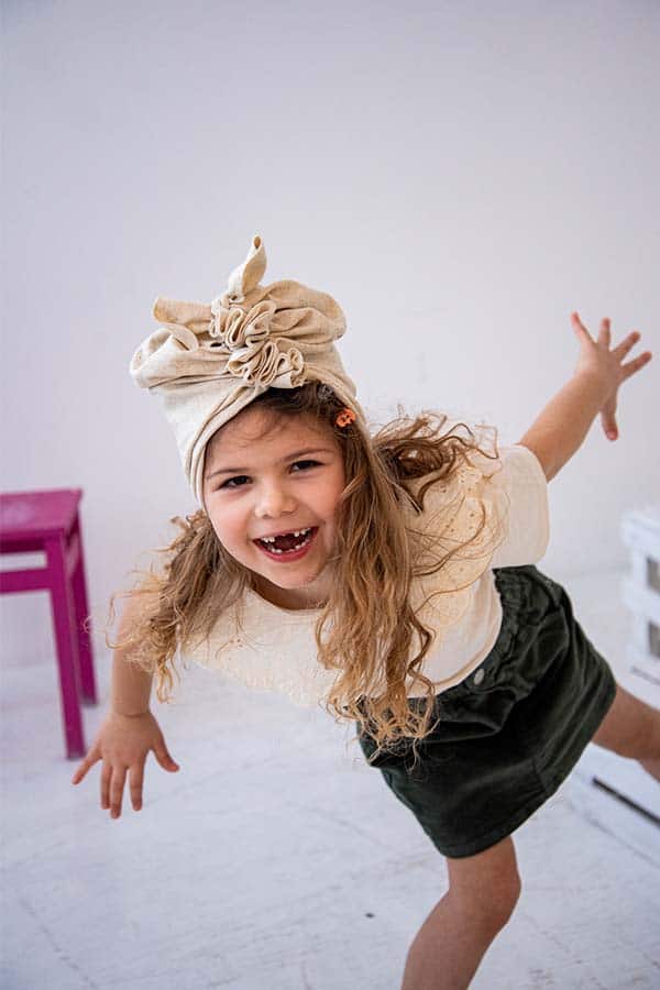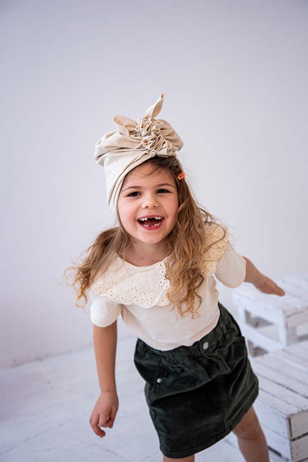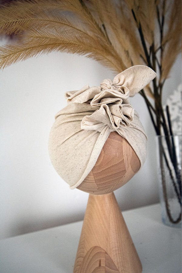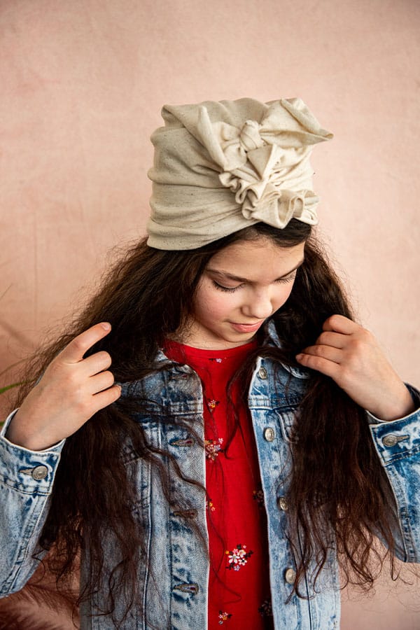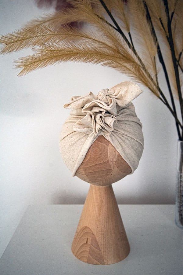 Turban z bawełny, lnu, elastanu i wiskozy w naturalnym, beżowym kolorze.