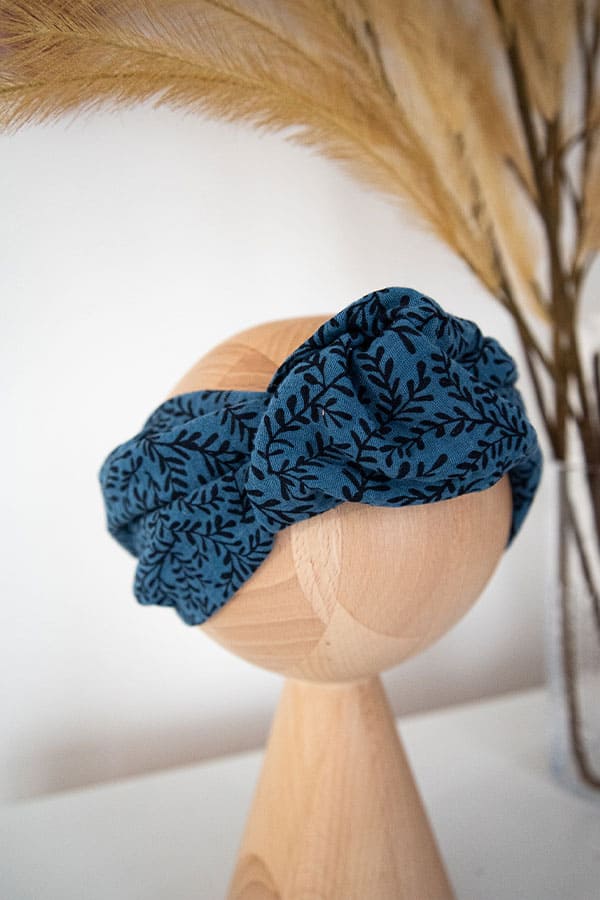 Muślinowa opaska dla dorosłych w kolorze granatowym o liściastym wzorze. Każda opaska jest na gumce, dzięki temu dopasowuje się i nie uciska głowy.
