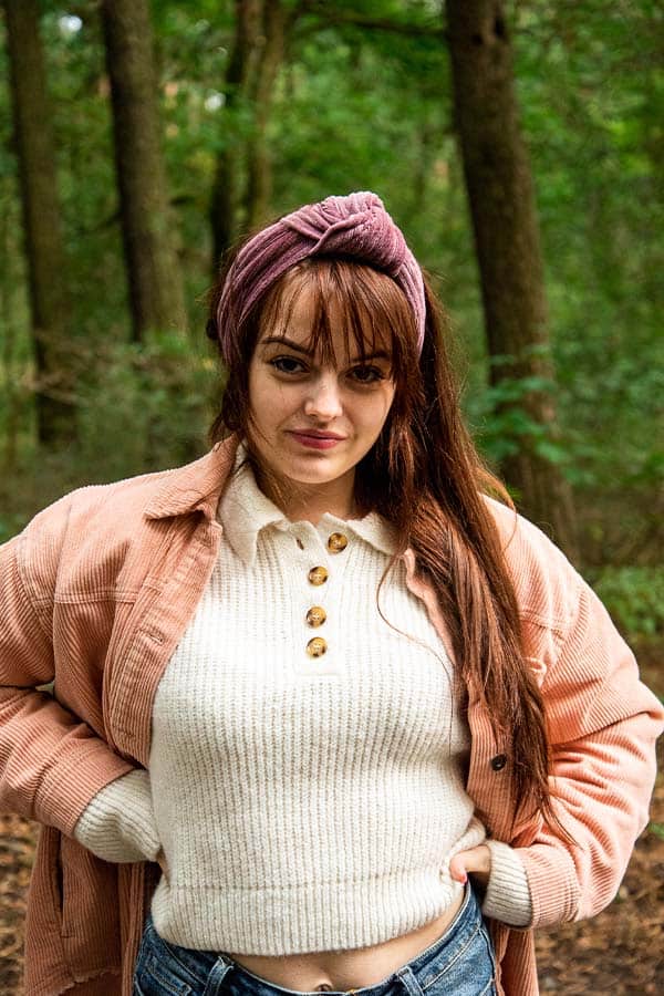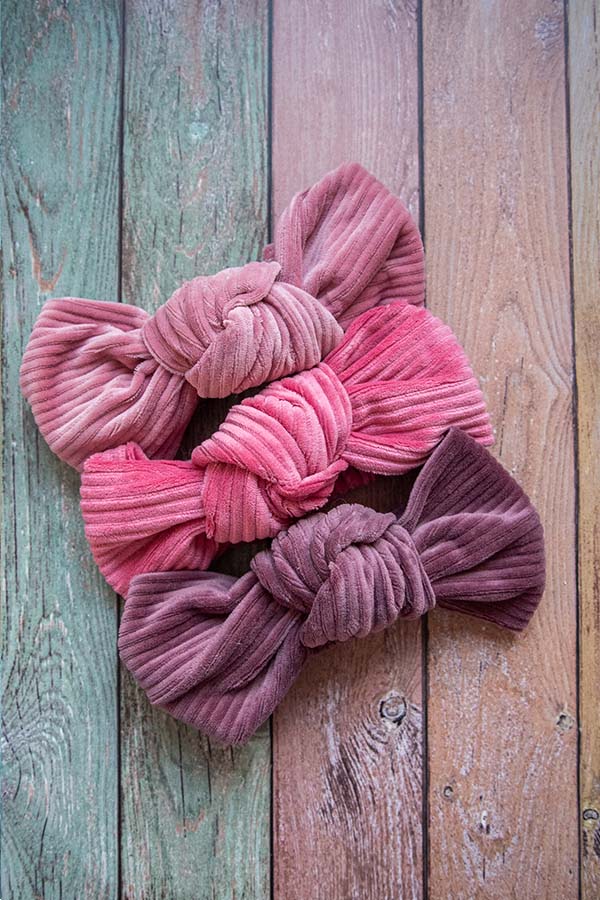 Welurowa, przyjemna w dotyku opaska z supełkiem. Welurowy materiał to głównie bawełna (70%) z dodatkiem poliestru (25%) i elastanu (5%). Dodatek elastanu sprawia, że materiał jest bardziej wytrzymały, mniej się gniecie. Dodatkowo opaski posiadają wszytą gumkę z tyłu, dzięki temu nie uciskają głowy.
